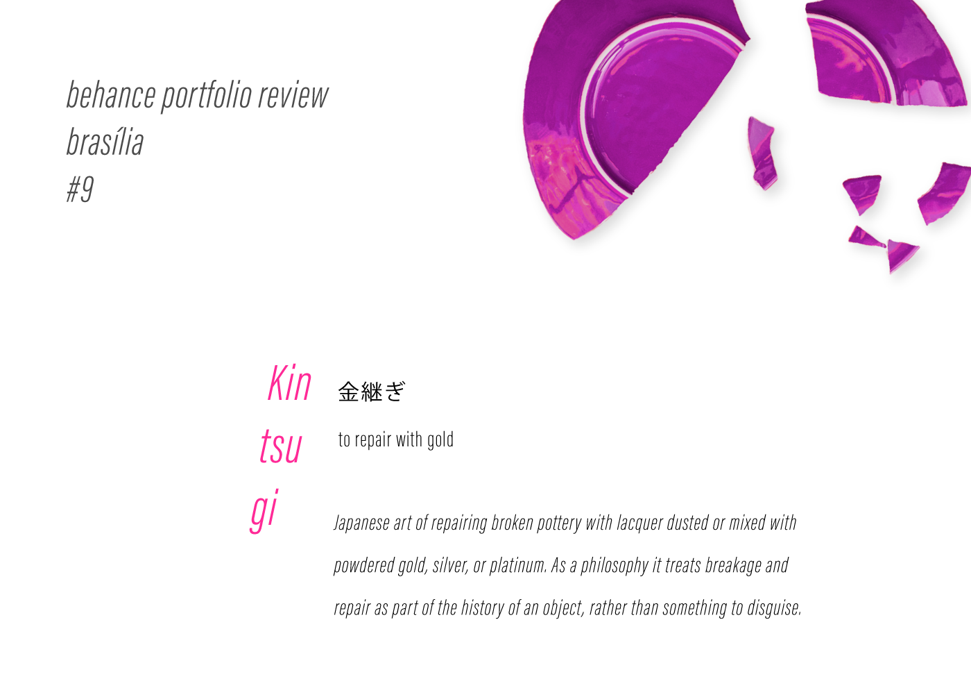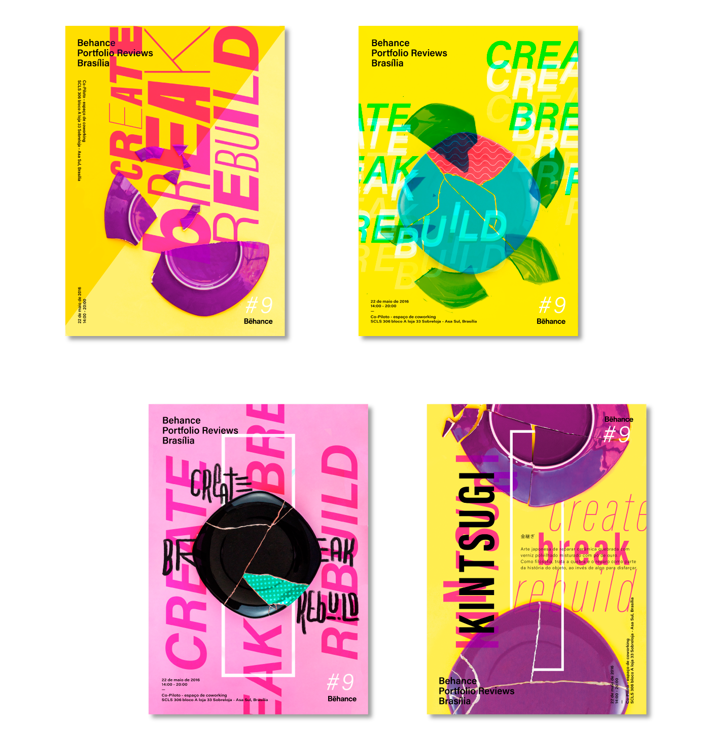 Posters for the 9th Behance Portfolio Reviews Brasília. Inspired by the japanese art and philosophy Kintsugi, that treats breakage and repair as part of the history of an object, rather than something to disguise. facebook.com/behancebrasilia/