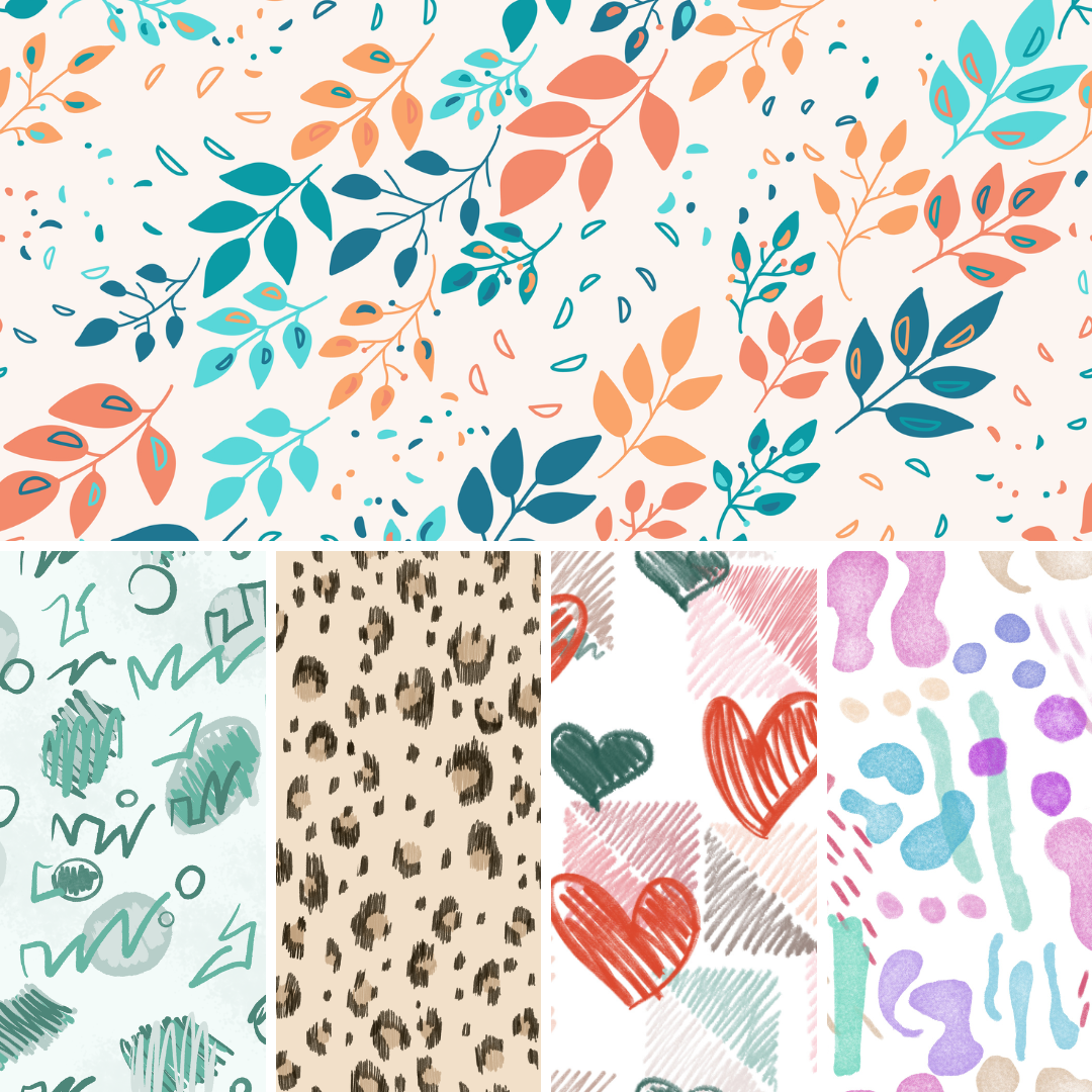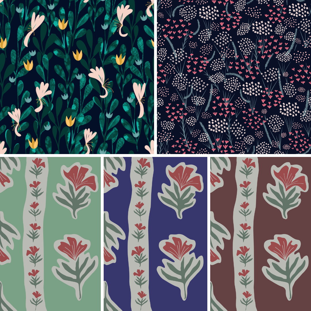 Todas estas estampas estão disponíveis no site Patternarium para licenciamento