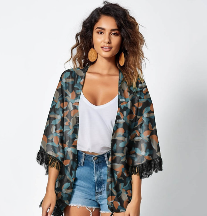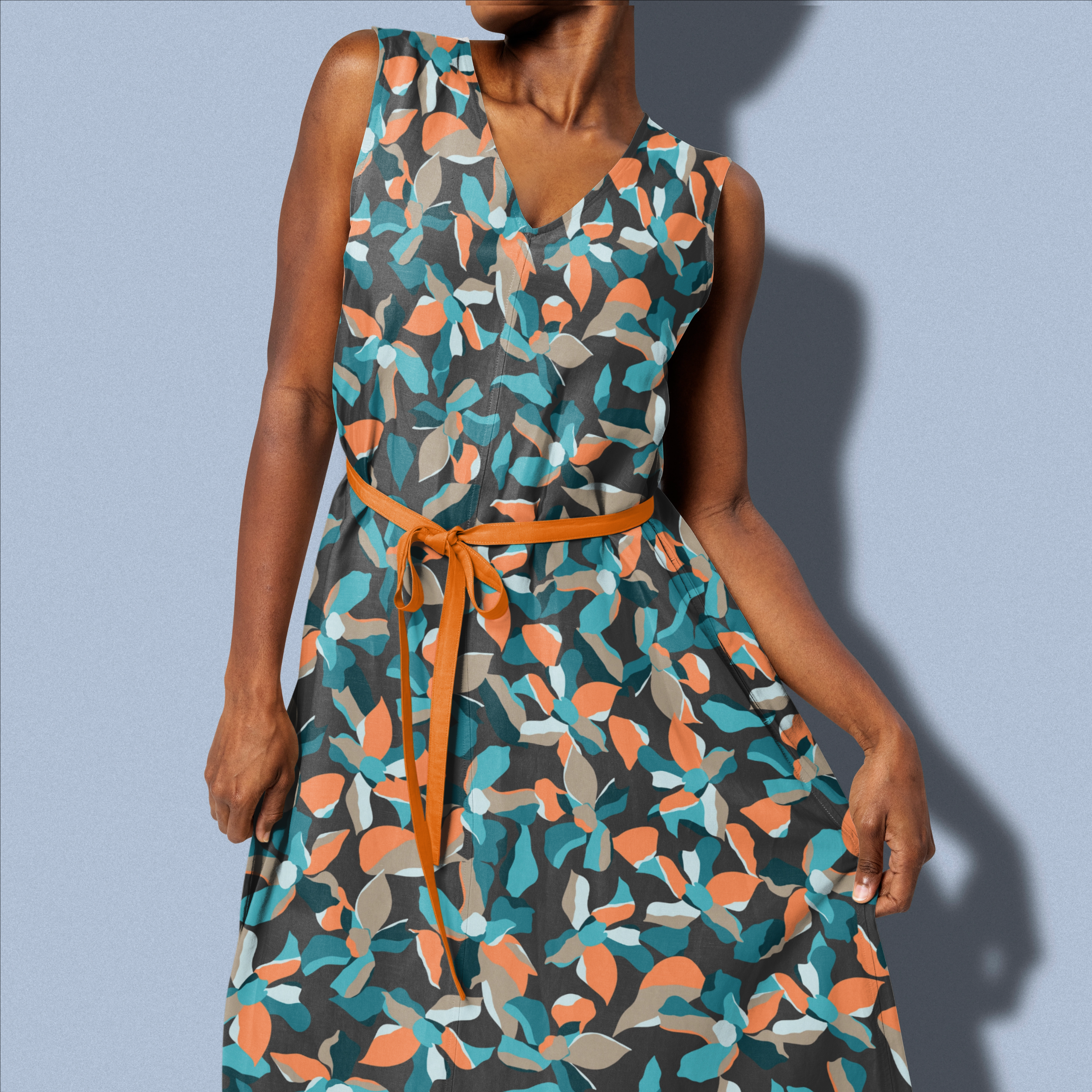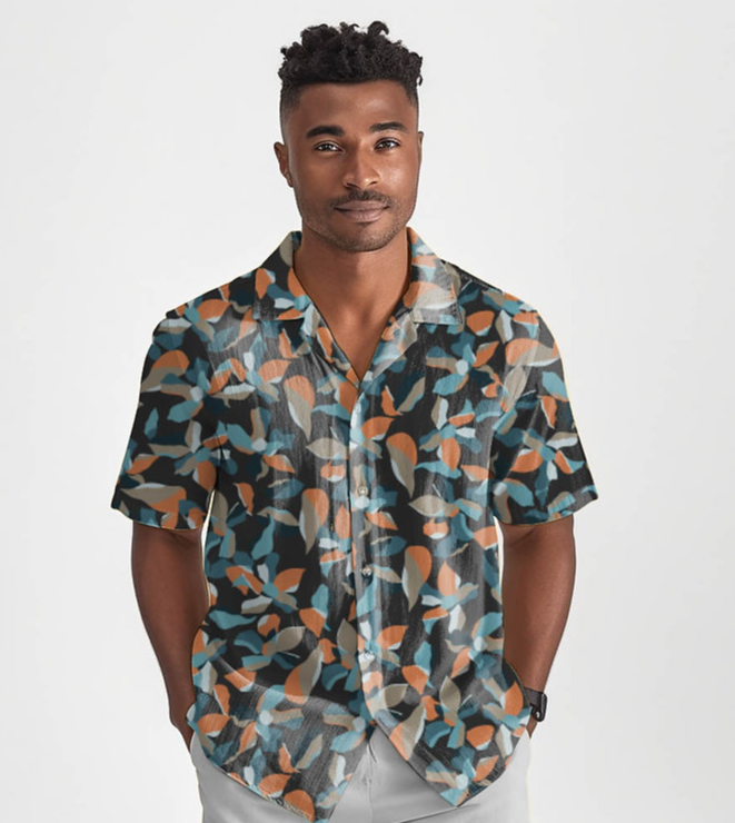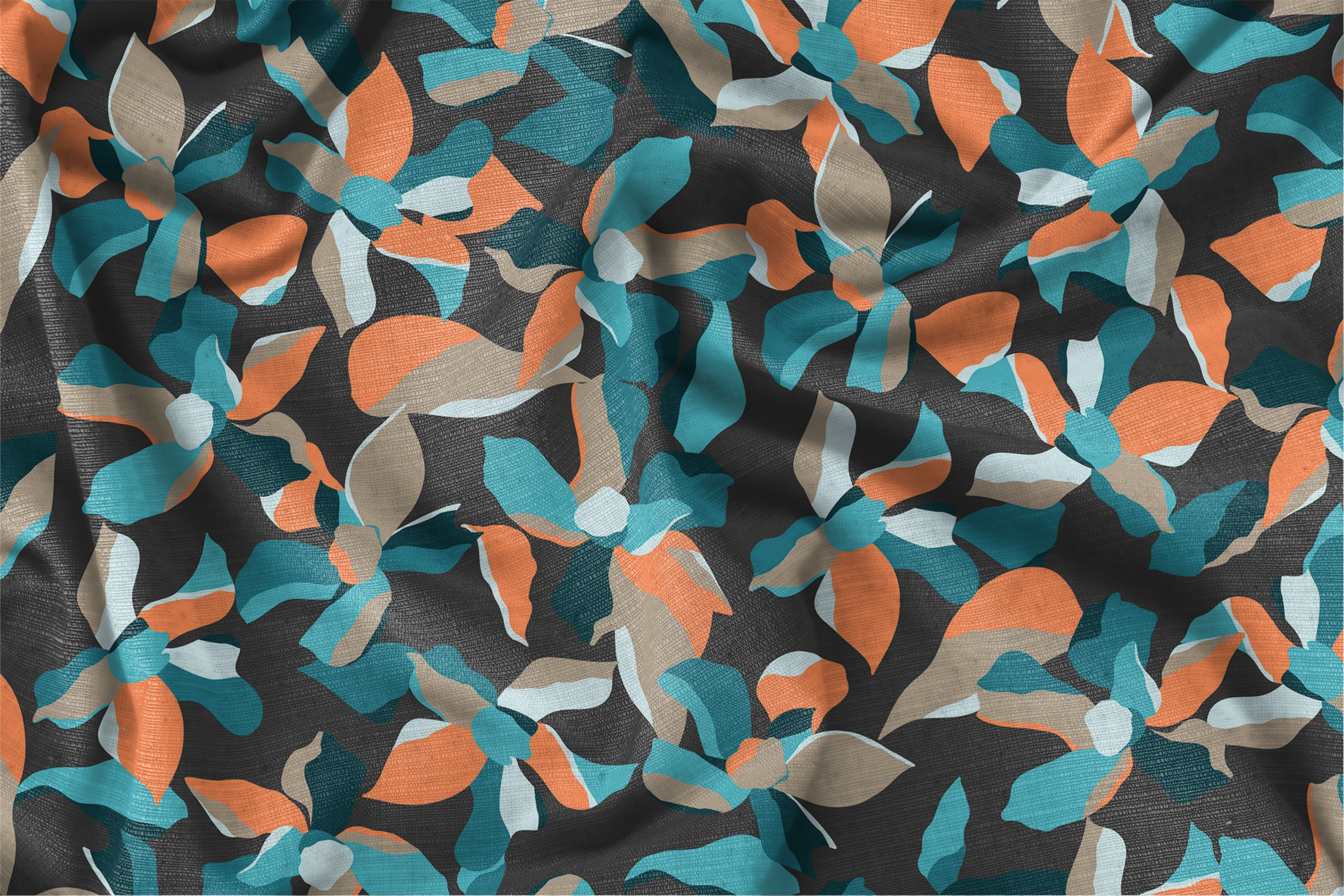 Estampa Pitangui Negra, com flores e folhas em formato abstrato, com cores marcantes e fundo escuro