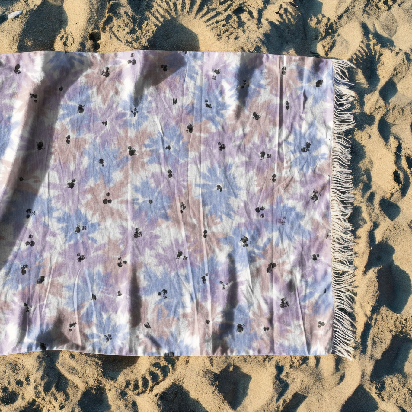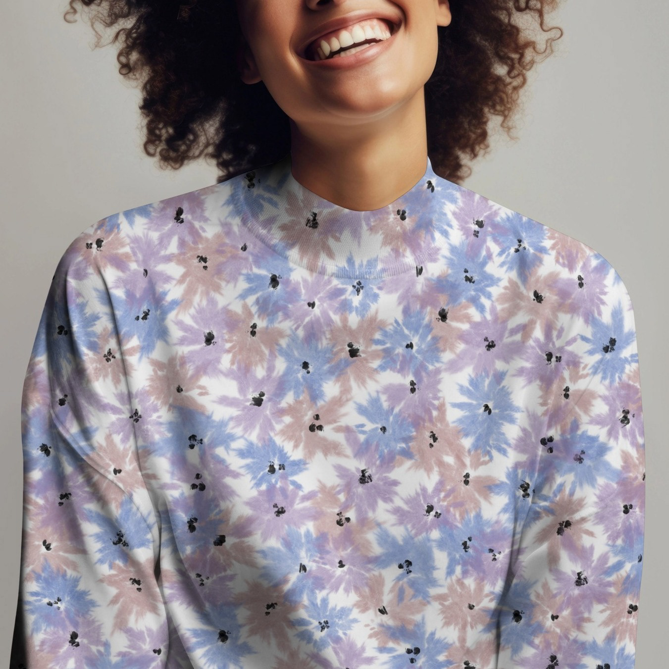 Estampa floral da flor Zínia Cactus, em estilo tie-dye e cores pastel.